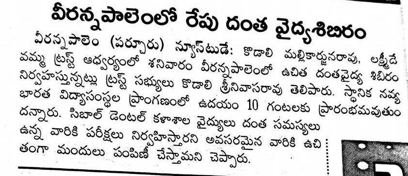 డాక్టర్ మువ్వా సురేష్ బాబు గారి సారధ్యంలో సిబార్ దంత వైద్యులు రోగులను పరీక్షించి తగిన చికిత్స చేస్తారు. ఈ వైద్య శిభిరంలో కోమల చారిటబుల్ ట్రస్ట్ వారు అవసరమైన మందులను రోగులకు ఉచితంగా పంపిణి చేస్తారు. అందరికి ఆహ్వానం, సుస్వాగతం.